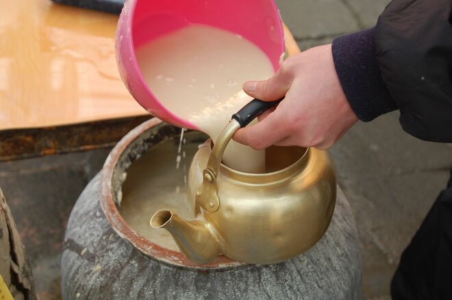 マッコリは日本でいえば「どぶろく」に似た酒だが、どぶろくよりも多く加水し、発酵時間も短いので、一般に流通しているもののアルコールは6度程度だ。