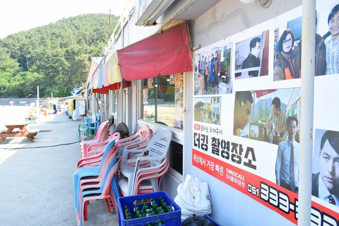 設定上の舞台、多大浦(釜山の西南端)の漁村場面では、簡易テーブルや縁台で、人々が楽しげに飲んだり食べたりしている。