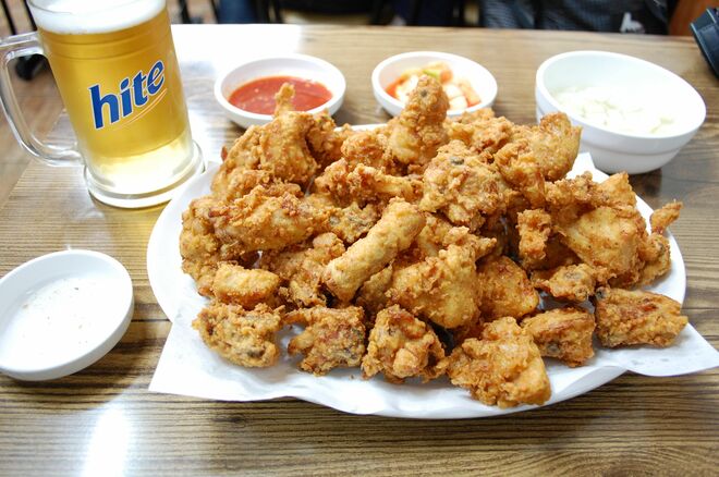 チキンでメクチュ(ビールの韓国語)を飲むことを略して「チメク」と呼んだりする。