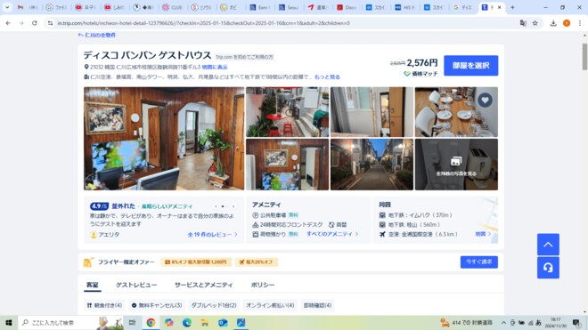 次いで1507マイルで宿泊できるディスコパンパンゲストハウスの宿泊代を調べてみる。三連休をはずした日程で、ホテル検索サイトで調べてみると2576円ということがわかってきた(図表3)。仁川にあるゲストハウスである。ここに泊まるかは別にして、とにかく最安値である。