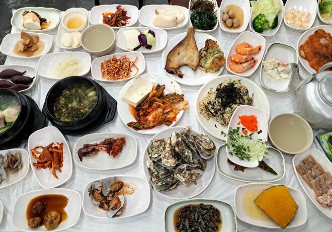 2人なら40000~45000ウォン程度でやかん入りマッコリと30種ほどのつまみが楽しめる。つくり置きのものが多いとはいえ、肉料理、焼き魚、貝類、汁物、ご飯物などがテーブルいっぱいに並ぶ様は壮観のひとこと。やかんマッコリを追加すると、さらによいつまみが出てくるシステムだ。