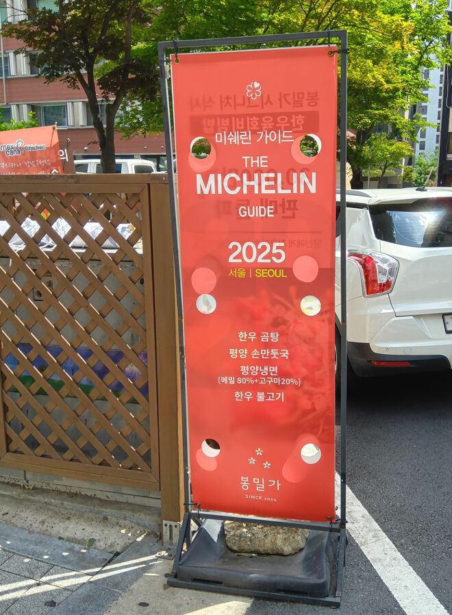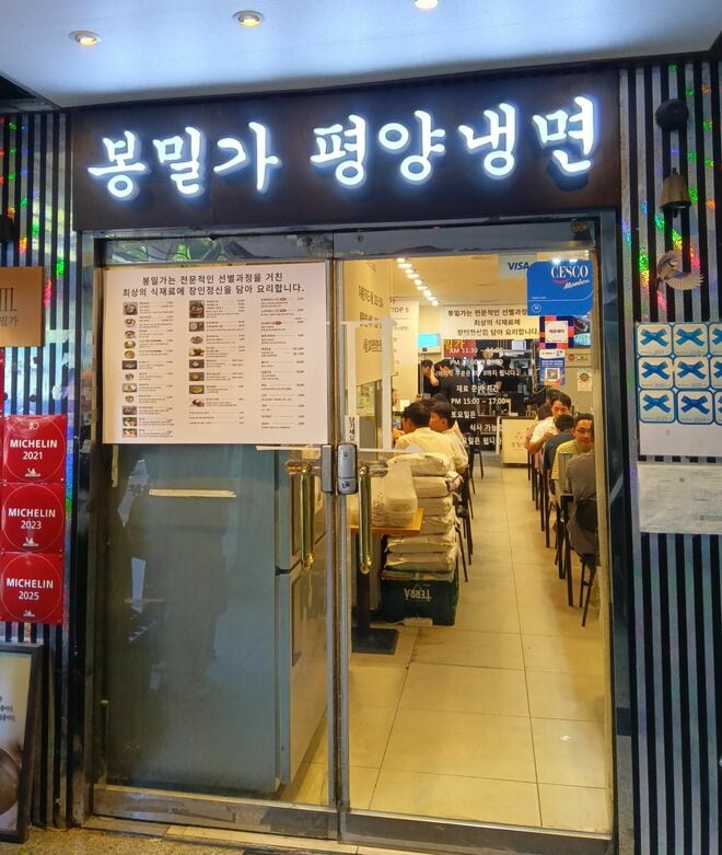 知人と一緒に、午前11時に平壌冷麺店『ポンミルガ』に着いた。連日、混みあっているという、という知人の言葉はぴったり当たった。11時だというのに、店の入口で待つ人が何人もいた。入口脇にはノートがあり、そこに名前を書き込むシステムだった。店内を眺めると、もうすべてのテーブルが埋まっている。