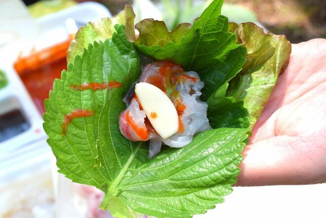 ■韓国では刺身を焼肉のように葉野菜で巻いて食べる