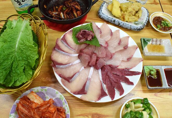 また、ワサビ醤油でも食べるが、チョジャン(酢+コチュジャン)やサムジャン(テンジャンやコチュジャンに甘味や香味野菜などを加えた合わせ味噌)、タデギ(唐辛子ベースの万能調味料)で食べる人のほうが多そうだ。マグロやブリなど赤身魚の場合は、ゴマ油+塩で食べる人も珍しくない。