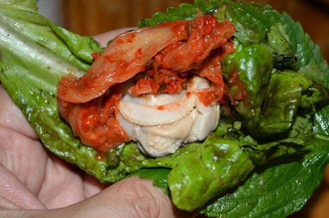 韓国に来る頻度が高くなり、食文化になじんでくると、海産物のサムが好きになってくる。筆者も今では白身魚の刺身はもちろん、イカ刺し、茹でたホタテなどもサンチュで巻いて食べている。