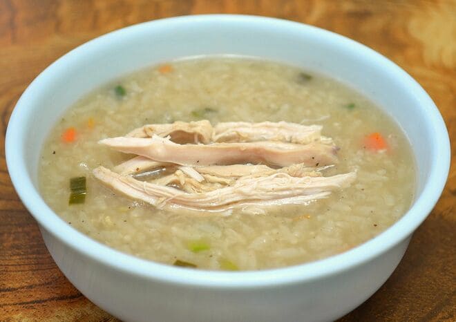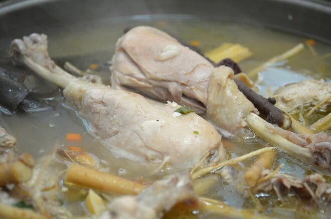 地鶏とともに煮込まれているのは高麗人参に似たキバナオウギの根。『隣の国のグルメイト』で松重豊がつまみながら「これ、木じゃん!」と驚いていたオムナム(ハリギリ)とはまた別種の生薬だ。それにナツメやクリ、ジャガイモなどが加わる。