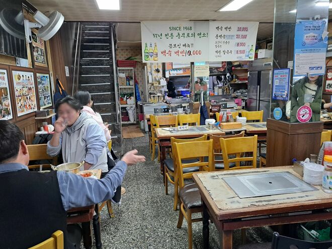 店名には「サランバン・カルグクス」と麺料理の名前が冠されているが、目玉はタッペクスッ。開業してから60年近く、幾度も皿や酒杯が行ったり来たりしてすり減ったテーブル、テレビで紹介されたことを伝えるパネルが臆面もなく貼られた壁は80年代テイストにあふれ、料理への期待が高まる。