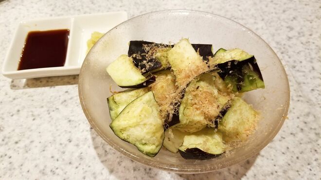 焼き炭の上を転がる茄子。黒紫色の皮から水気が染み出てくる。皮をむくと淡い緑色の果実が姿を現す。おろし生姜を添える。ふられた鰹節が踊り出す。「サッとお醤油かけて召し上がってね」と女将の声。