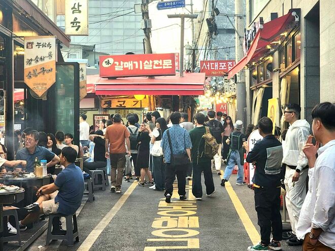 「味」の文字が入っている看板の店が「味カルメギサル専門」。その右後ろの赤い看板が「ソデポチプ」●配信情報
