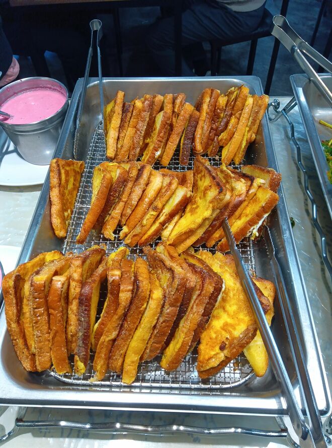 ビュッフェとしたら有名店だから、どんな料理に人気が集まるのか、といった経験でメニューが決まってくるのだろう。しかし、どこか節操がないようにも映る。その代表がフレンチトーストだった。この店は自販機のコーヒーもあるから、朝食? と考えてみるのだが、隣にいた老人の皿を見ると、ご飯、おかずの横に、しっかりとフレンチトーストが載っている。