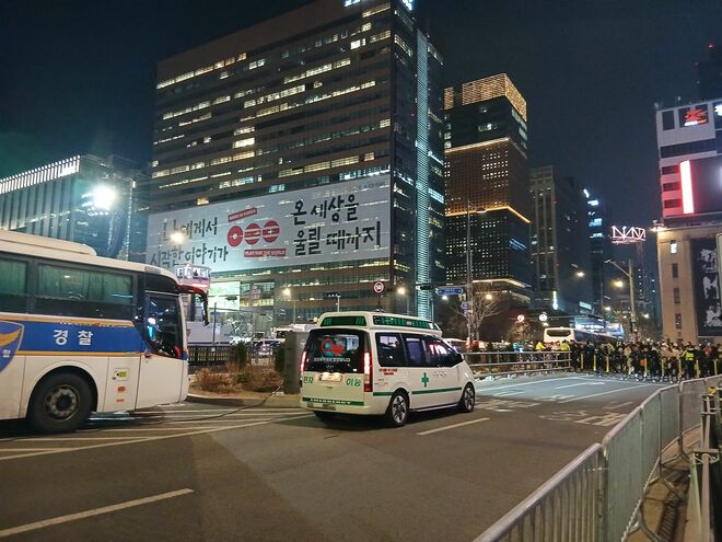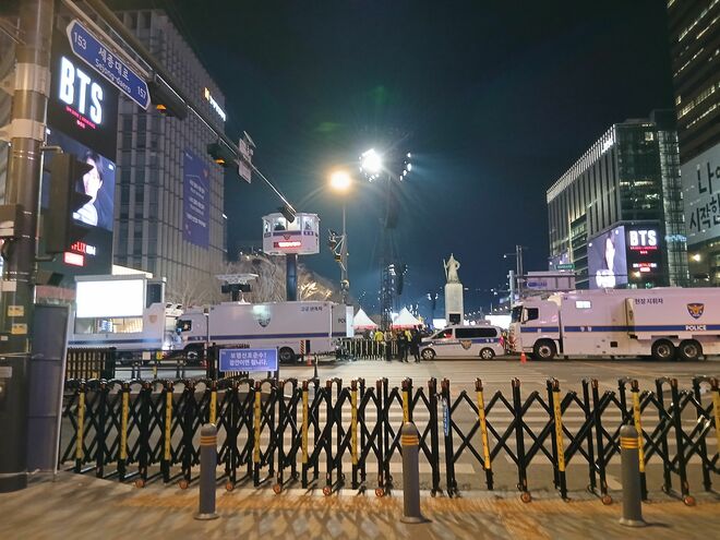 一方、今回のイベントで目立ったのは警察の厳重な警備だ。当初、26万人が集まるとして警察は約6700人の警察官を投入。ファンが広場に入る際、警備ゲートで荷物検査が行われ、金属探知機での確認も行われた。また、大型の警察車両が交差点付近で道路と道路を封鎖し、ファンの自由往来を阻止。通路に立ち止まるとすかさず「ピー」「ピー」と警笛を吹き、「向こうに行ってください!」と押し出される。付近の地下鉄駅出入口は大混雑発生を防ぐため閉鎖された。消防や区役所職員など、公務員約3400人も警備に駆り出されており、“過剰警備”という声も上がっていた。