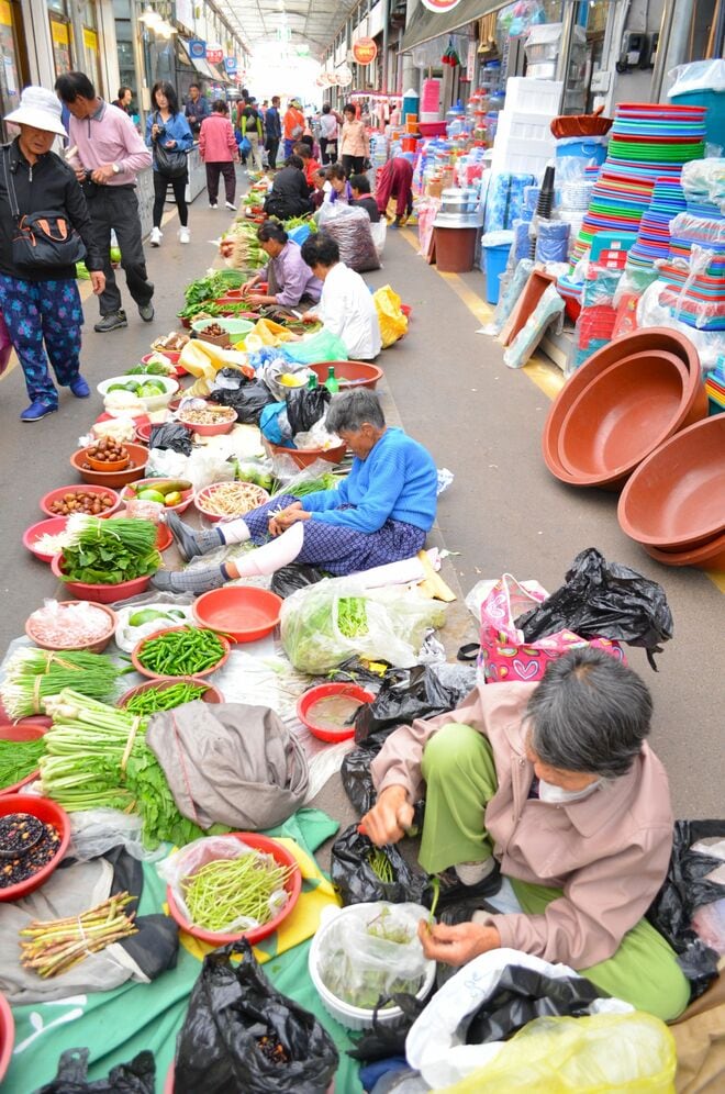その日は在来市場で恒常的に商売をしている固定店舗だけでなく、近隣の農村、漁村のハルモニたちが集まってきて地べたで産物を商う。大型スーパーの地方出店や通販の普及によって5日場の規模は縮小しつつあるが、田舎に行けば行くほど活気ある売り買いの様子を見ることができる。その様子は外国人の目には祭りのように映るはずだ。
